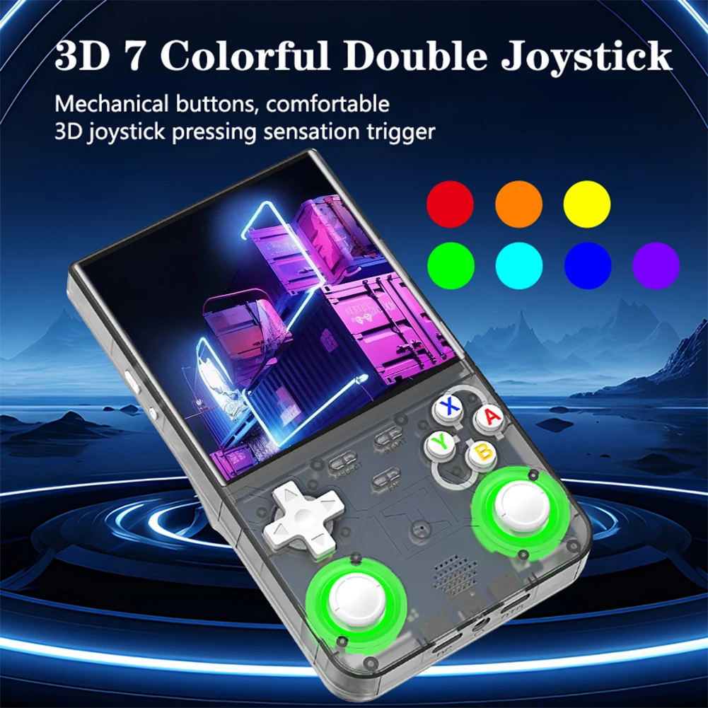 Features: 1.Built-in Wi-Fi Capability: Enjoy seamless multiplayer gaming without needing an external adapter. This integrated retro gaming console makes connecting with friends easier than ever. 2.High-Speed Memory Performance: With 1GB of high-frequency RAM, this retro handheld game console ensures smooth gameplay at 30fps, offering an immersive experience. 3.8GB Internal System Storage: The mini open source console features pre-installed storage that supports system recovery, eliminating post-purchase worries. 4.Vivid Display Screen: The 4-inch 720×720 IPS screen on the portable pocket video player delivers clear and vibrant visuals for an exceptional gaming experience. 5.Customizable LED Lights: Enhance your gaming environment with dual joystick multicolored LED lights, allowing for seven color options on the portable video game player.Specification: Origin: Mainland China System: Multiple open source Linux systems Built-in emulator: supports CPS1/CPS2/CPS3/MAME2003/ATARI5200/ATARI7800/PCE/FC/NE S/SFC/SNES/N64/GB/GBA/GBC/NDS/SG- 100/MD/GG/DC/NEOGEO/NGP/NGPC/PS1 Screen: 4-inch IPS OCA fully laminated high-definition screen, 720*720 resolution CPU: RK3326 Cortex-A35 CPU, 1.5GHz GPU: Mali-G31MP2 supports OpenGL ES 3.2 RAM: LPDDR3 1GB ROM: EMMC 8GB WIFI: 2.4G WiFi Speaker: built-in 1*8W 1Ω cavity speaker Joystick: ADC dual joystick-7 color light Battery capacity: built-in lithium battery 3000mAh Battery life: 5H Charging time: 1H Interface: Type-C charging interface, Type-C-OTG data port, earphone (standard 3.5mm interface) Product weight: 200g Packaging weight: 330g Product size: 145.00×85.00×30.00mm/5.71×3.35×1.18inch Packaging size: 168x105x47mm/6.61×4.13×1.85inch Note: